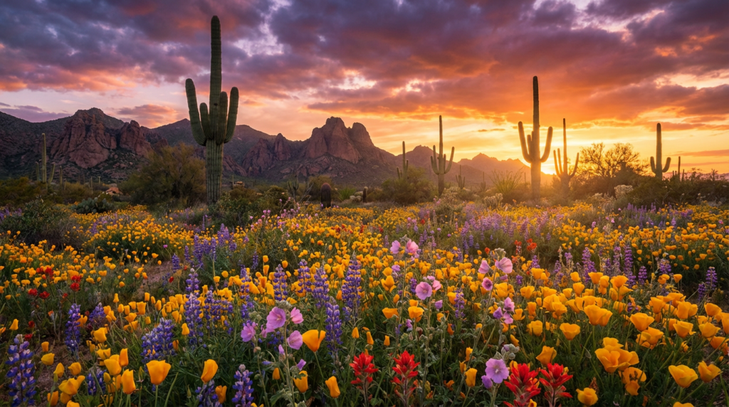 Wildflowers transform Arizona into something almost surreal—fields of orange and purple stretching across golden desert valleys while towering cacti stand guard overhead.