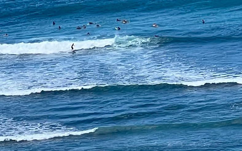 We stared out at the surfers below, amazed at how blue the water was — a totally different hue from our usual Florida coast haunts.