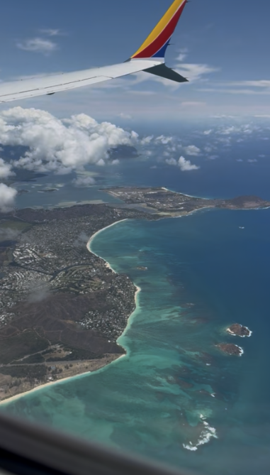In the approach to Honolulu, we were tired but so excited to see the coastline of Oahu as we tried to locate Diamond Head and Pearl Harbor from the air.
