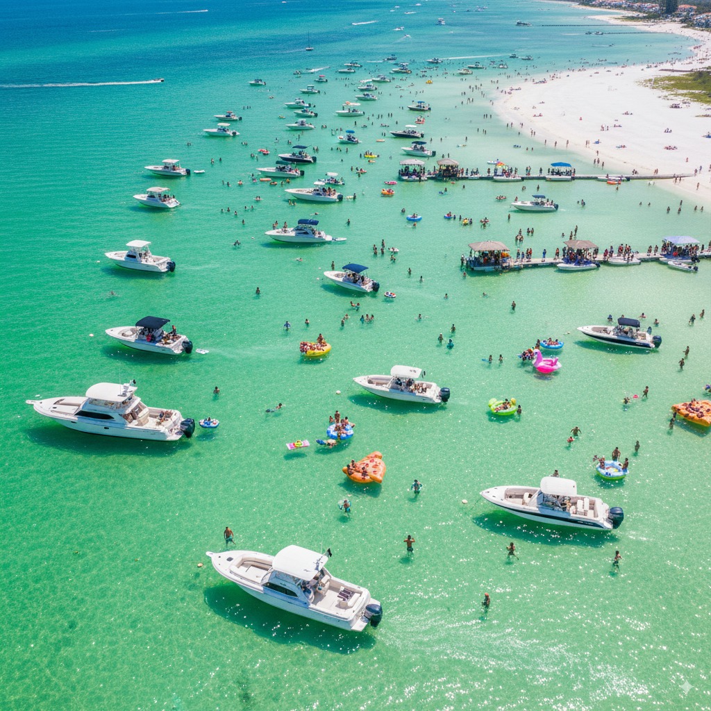 Crab Island is a fun day trip from Destin. It has shallow waters and a lively vibe. You can swim, float, and hang out in a beach party setting.